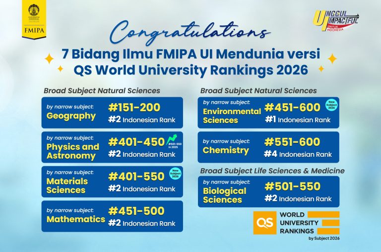 Fakultas Matematika dan Ilmu Pengetahuan Alam (FMIPA) Universitas Indonesia (UI) kembali menorehkan prestasi di kancah internasional. Sebanyak tujuh bidang ilmu berhasil masuk dalam pemeringkatan dunia QS World University Rankings by Subject 2026, meningkat dari tahun sebelumnya yang hanya mencakup lima bidang.