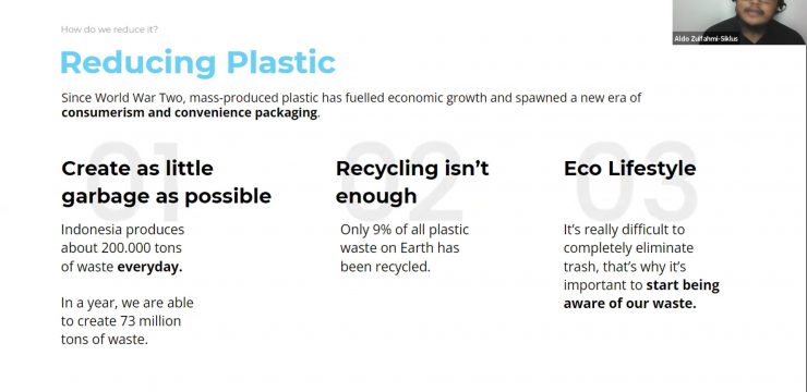 Presentasi yang berjudul “Plastic Waste: How to Tackle it with Siklus” tersebut menampilkan materi terkait peningkatan limbah plastik pada masa pandemi hingga bagaimana pengaruh sampah plastik di lingkungan perkotaan terhadap perubahan iklim.