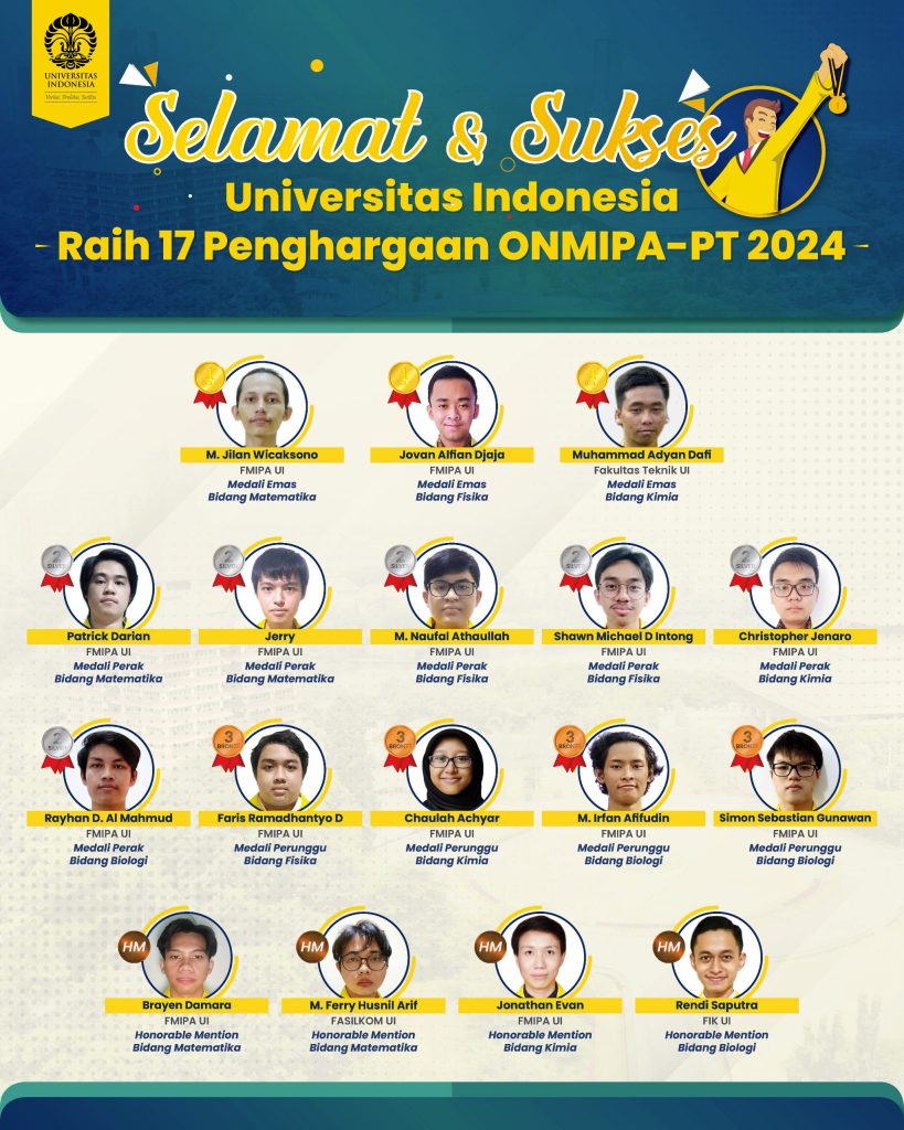Prestasi nasional kembali diukir oleh kontingen Universitas Indonesia (UI). Kali ini UI yang diwakili 17 mahasiswa dari lintas fakultas meraih penghargaan terbanyak dalam ajang Olimpiade Nasional Matematika dan Ilmu Pengetahuan Alam – Perguruan Tinggi (ONMIPA-PT) 2024. Kontingen UI yang didominasi oleh mahasiswa dari Fakultas Matematika dan Ilmu Pengetahuan Alam (FMIPA), berhasil meraih juara di setiap cabang lomba yang dikompetisikan, yaitu Matematika, Kimia, Fisika dan Biologi.