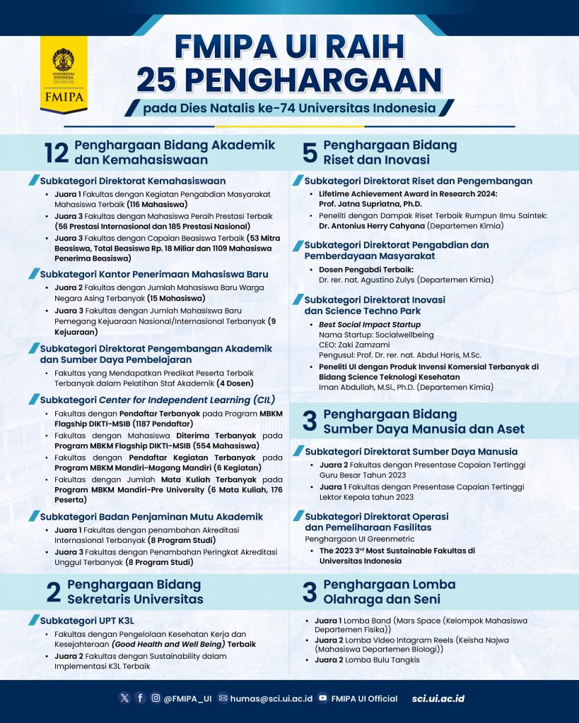The Faculty of Mathematics and Natural Sciences (FMIPA) UI is one of the faculties with the most awards. The total awards won by FMIPA UI amount to 25 from 4 main fields. Of the total, 3 of them are awards for sports and arts competitions.
