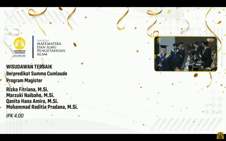 Total wisudawan FMIPA UI berpredikat Summa Cumlaude berjumlah 17 orang, sedangkan yang berpredikat Cumlaude mencapai 175 orang. Dari program sarjana, sebanyak 144 orang meraih predikat cumlaude, dan 5 orang meraih summa cumlaude. Wisudawan dengan IPK tertinggi diraih oleh Enrico Yauri, S.Aktr. dari Program Studi Ilmu Aktuaria, dengan IPK 3.98 dan predikat Summa Cumlaude.