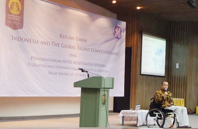 Manager Riset dan Pengabdian Masyarakat (RPM) FMIPA UI, Dr. Djoko Triyono pada hari senin (13/04/2015) menghadiri Public Lecture yang menghadirkan narasumber, Dr. Handry Santiago, CEO of GE Indonesia. Public Lecture yang diselenggarakan di Balai Sidang UI ini bertema “Indonesia and The Global Talent Competitiveness”, selain dihadiri oleh para pimpinan Universitas Indonesia maupun para pimpinan Fakultas, juga dihadiri oleh dosen dan mahasiswa di lingkungan UI.