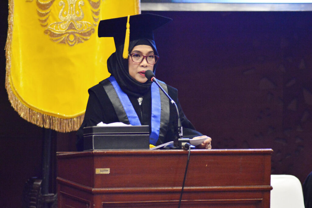Selanjutnya, Prof. Ivandini menyampaikan pidato pengukuhan berjudul “Diamond Berkonduktivitas Listrik sebagai Material Unggul dalam Monitoring Kesehatan, Pengelolaan Lingkungan dan Penyedia Energi”.