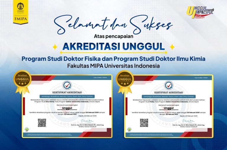 Depok, 11 Maret 2026 – Program Studi Doktor (S3) Ilmu Kimia dan Program Studi Doktor (S3) Fisika Fakultas Matematika dan Ilmu Pengetahuan Alam (FMIPA) Universitas Indonesia (UI) resmi memperoleh peringkat Akreditasi Unggul dari Lembaga Akreditasi Mandiri Sains Alam dan Ilmu Formal (LAMSAMA). Penetapan tersebut berlaku untuk kedua program studi mulai 26 Februari 2026 hingga 25 Februari 2031.