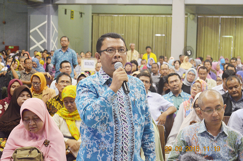 Di akhir acara para orang tua mahasiswa baru FMIPA UI angkatan 2016 diberikan kesempatan untuk bertanya ataupun menyampaikan saran yang dapat mendukung kemajuan FMIPA UI kepada para pimpinan FMIPA UI. Sesi tanya jawab dan diskusi ini dimoderatori oleh Dr. Tito Latif Indra selaku Manajer Kemahasiswaan, Kerja sama dan Alumni FMIPA UI.