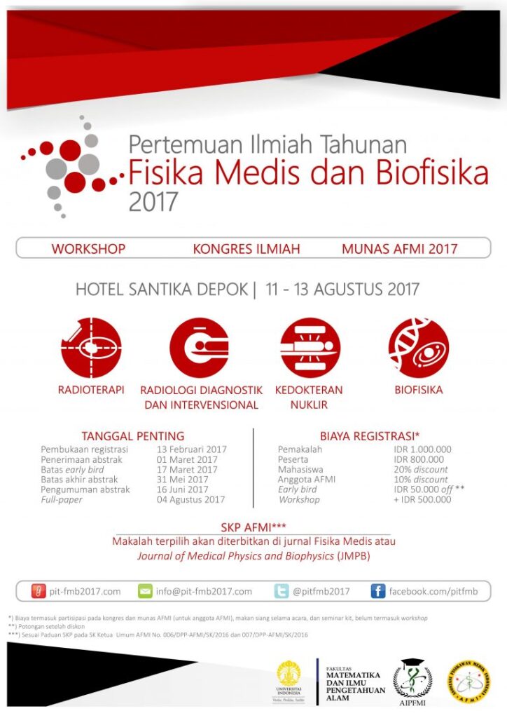 Peminatan Fisika Medis dan Biofisika, Departemen Fisika, Fakultas Matematika dan Ilmu Pengetahuan Alam, Universitas Indonesia menginisiasi Pertemuan Ilmiah Tahunan (PIT) Fisika Medis dan Biofisika 2017 di Hotel Santika Depok pada 11-13 Agustus 2017, yang di dalamnya sarat muatan akademik dan ilmiah sebagai wadah dan upaya peningkatan semangat dan kualitas riset Fisika Medis dan Biofisika di Tanah Air.