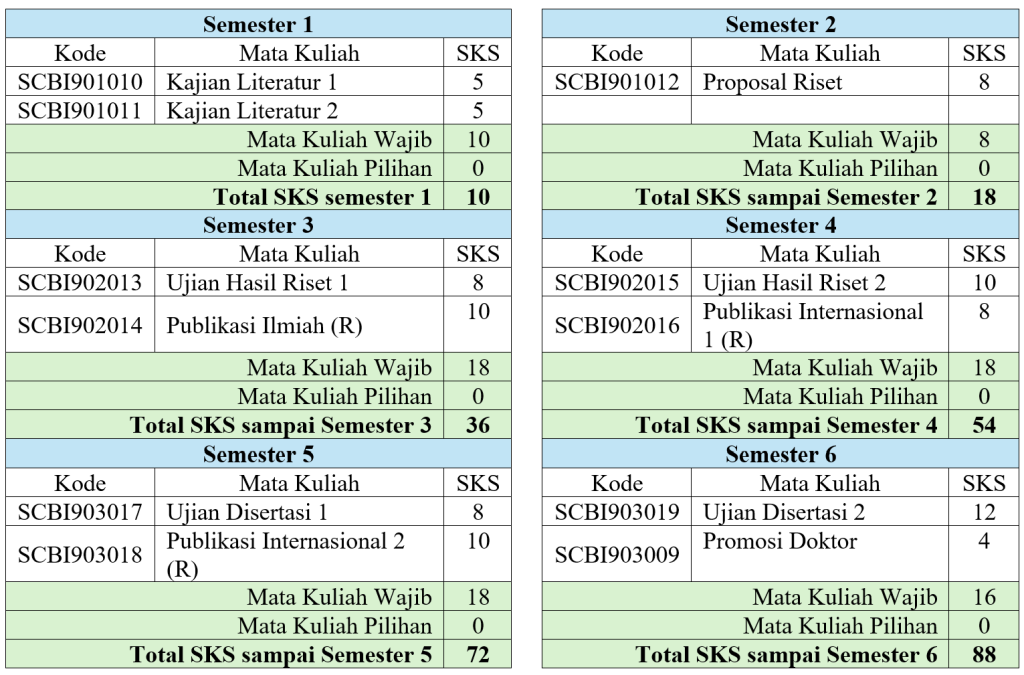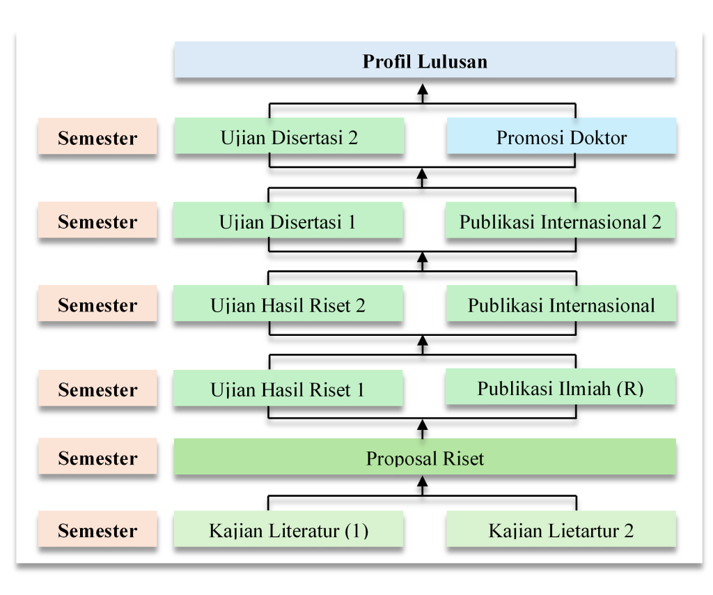 Struktur kurikulum Jalur Riset terdiri atas 11 modul wajib: Kajian Literatur 1 dan 2, Proposal Riset, Ujian Hasil Riset 1 dan 2, Publikasi Ilmiah, dan 2 Publikasi Internasional Ujian Disertasi, dan Sidang Promosi. Kurikulum Jalur Riset mengharuskan mahasiswa untuk mengambil minimal 88 SKS.