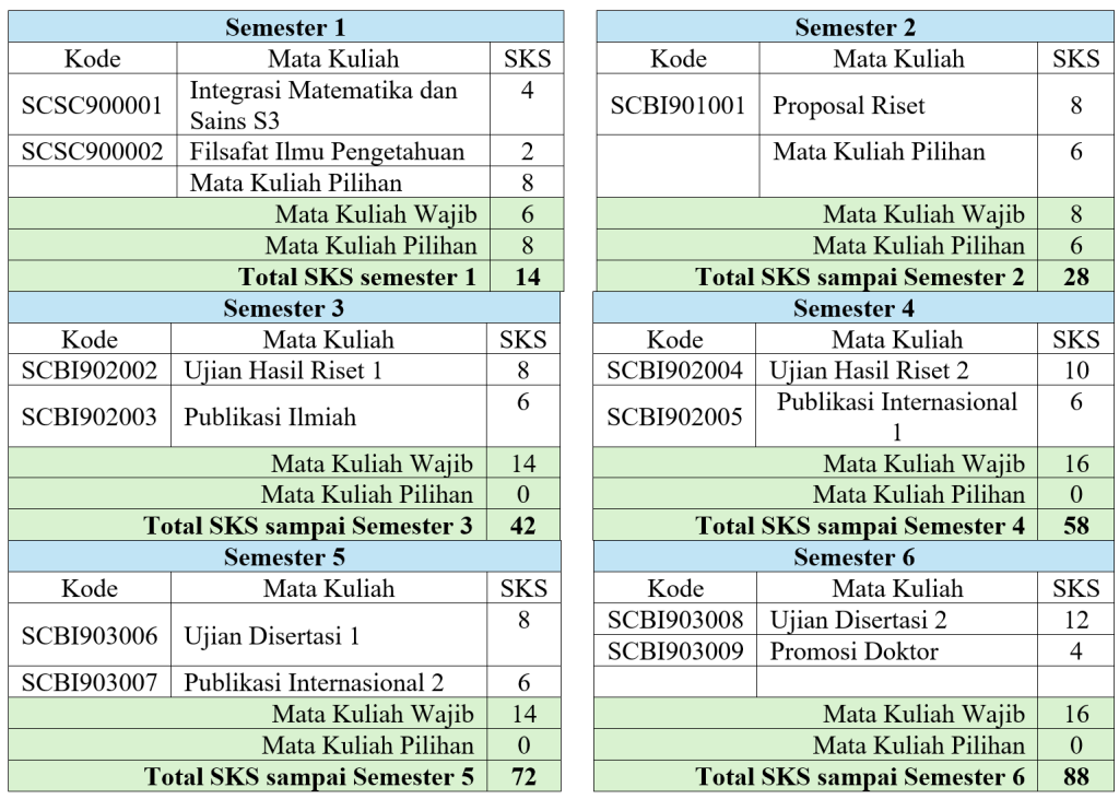 Kurikulum Jalur Kuliah-Riset mengharuskan masiswa untuk mengambil minimal 88 SKS, terdiri atas 74 sks kuliah wajib dan 14 sks kuliah pilihan. Kuliah wajib terdiri atas 12 modul: Filsafat Ilmu, Integrasi Sains dan Matematika, Proposal Riset, Ujian Hasil Riset 1 dan 2, Publikasi Ilmiah, 2 Publikasi International, Ujian Disertasi dan Promosi.
