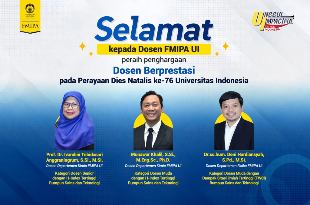 Tiga dosen Fakultas Matematika dan Ilmu Pengetahuan Alam Universitas Indonesia (FMIPA UI) meraih penghargaan Dosen Berprestasi pada peringatan Dies Natalis ke-76 Universitas Indonesia. Penghargaan tersebut diberikan atas capaian kinerja akademik dan kontribusi riset di bidang Sains dan Teknologi.